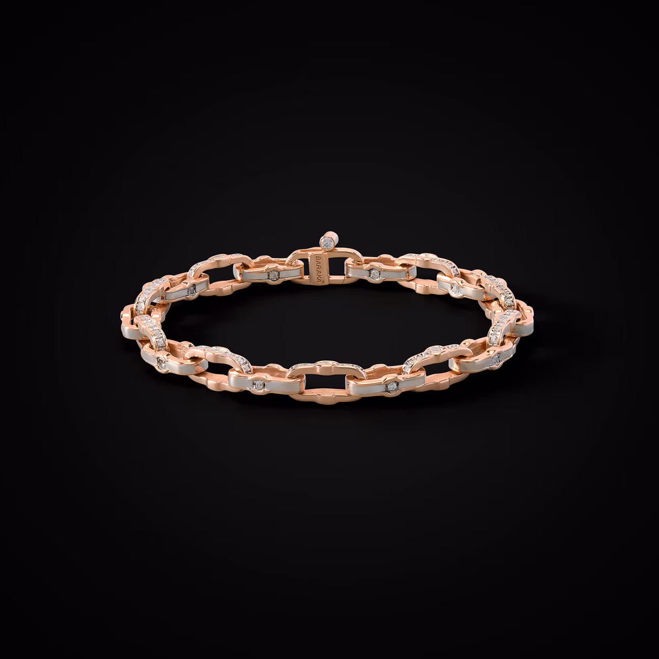 Цей вишуканий браслет із колекції Lui e Lei переосмислює легендарний ланцюг бренду, надаючи йому жіночного звучання та сучасного характеру. На золотих елементах, доступних у різних відтінках, центральне місце займає діамант, що підкреслює витонченість та символізує внутрішню силу. Застібка з діамантом на пересі повторює форму ланки, створюючи завершений гармонійний силует. Прикраса уособлює незалежність, стиль і впевненість жінки, яка обирає Baraka Donna.