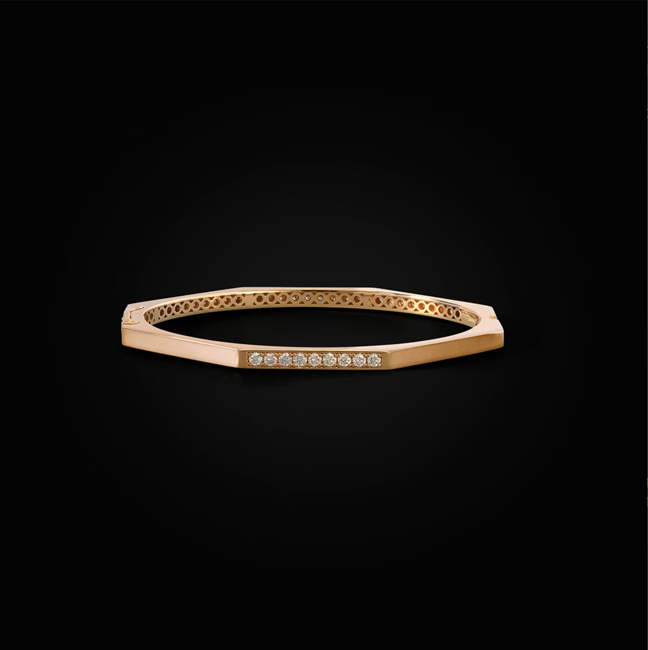 Діаманти відіграють провідну роль у колекції Ottagono, де кожен елемент перетворюється на символ сили та бездоганної естетики. Жорсткий браслет восьмигранної форми від Baraka Donna виконаний із золота й оздоблений діамантами, що повністю вкривають одну зі сторін, створюючи інтенсивну лінію сяйва.
