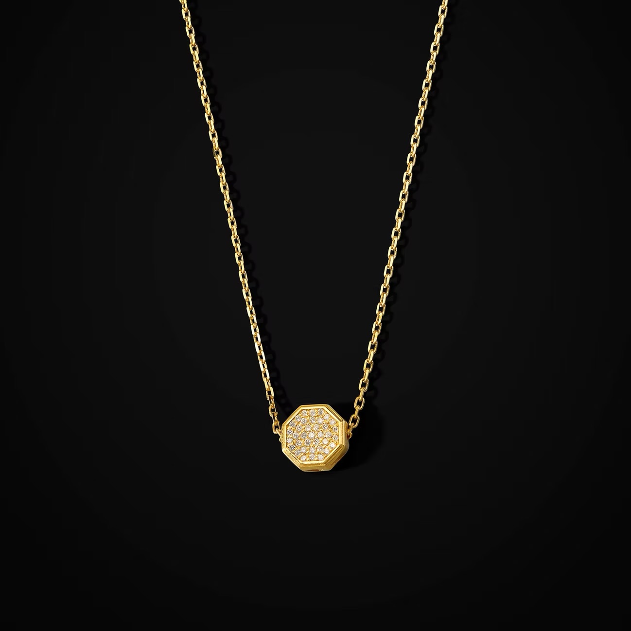 Геометрія, довершеність і світло — три складові цього вишуканого кольє. Форма октагона, фірмовий символ Baraka Donna , увібрала в себе паве з діамантів, що підсилюють сяйво й привертають погляд з першої секунди.