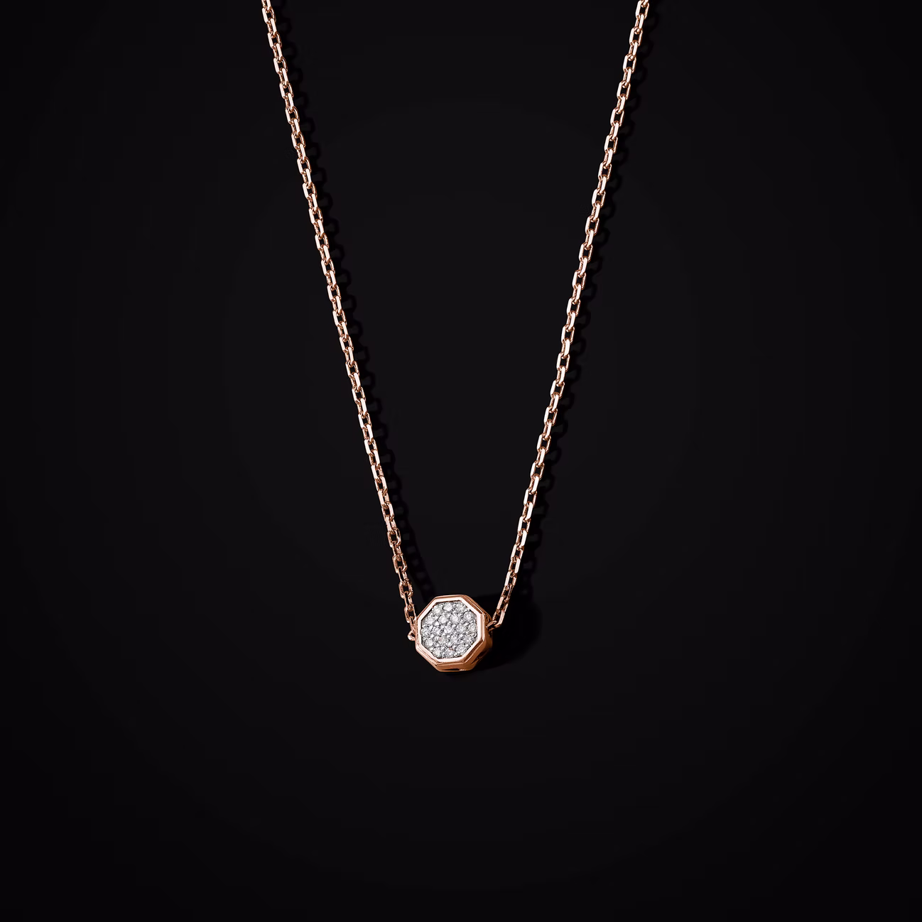 Кольє з підвіскою-октагоном із золота — це втілення сяйва жінки, яка впевнено заявляє про себе в будь-якій аудиторії. Фірмовий восьмигранник Baraka Donna перетворюється на елегантну сцену для діамантів, майстерно закріплених так, щоб ловити світло з кожним рухом. Лаконічна форма, продумана симетрія та виразне мерехтіння створюють образ, що поєднує сучасність і позачасову розкіш. Це прикраса для жінки, яка цінує досконалість, силу ліній і бездоганну італійську майстерність.