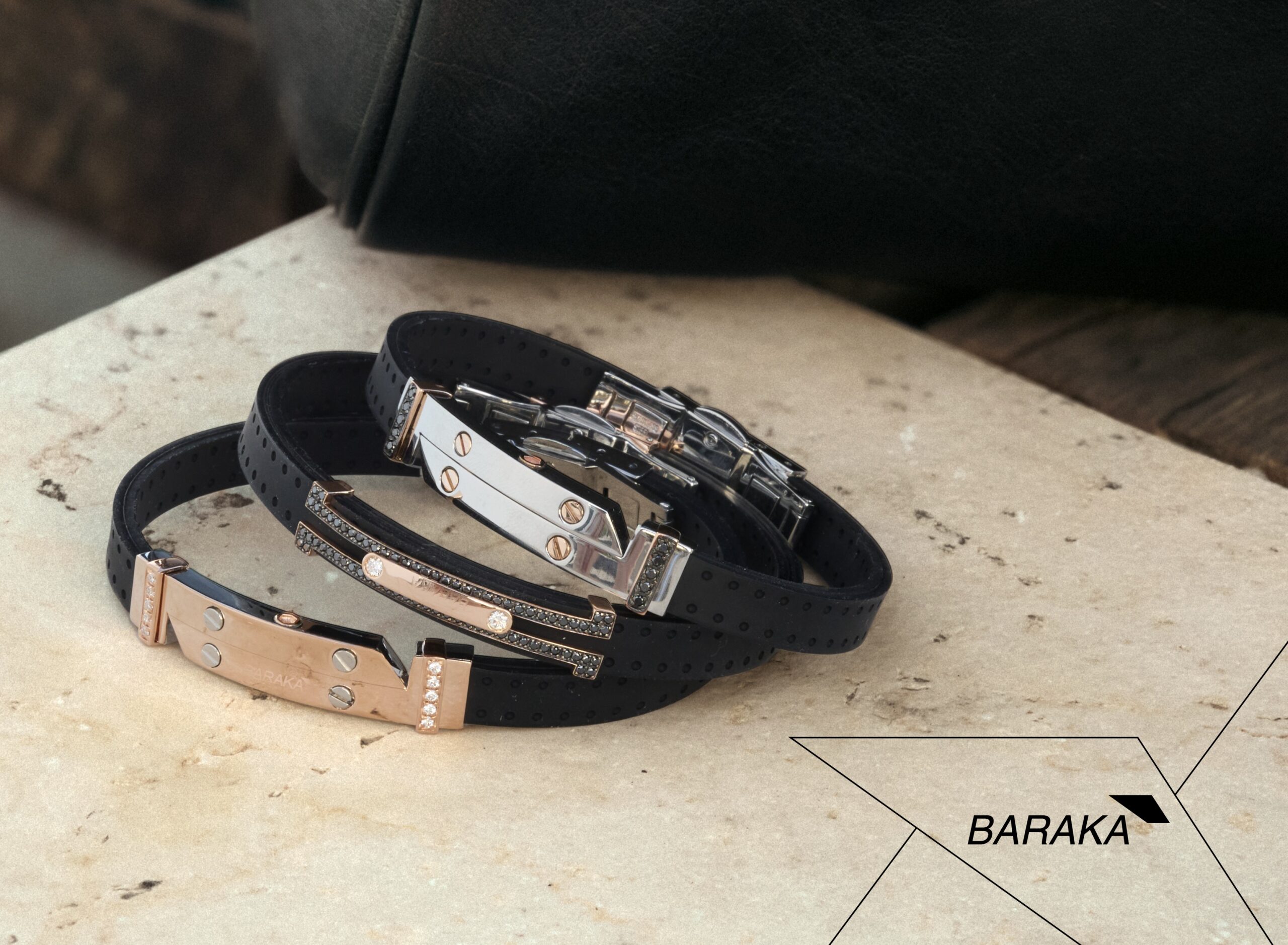 Barakà поєднує дорогоцінні метали з високотехнологічними матеріалами, створюючи вивірений чоловічий стиль. У виробах відчутні конструктивність і точність: геометрія, надійні з’єднання, продумана ергономіка. Комбінації золота 18K з карбоном, керамікою чи сталлю формують сучасний, стриманий силует. Прикраси Barakà доречні в діловому та повсякденному вбранні, підкреслюють дисципліну та вимогливість до деталей.