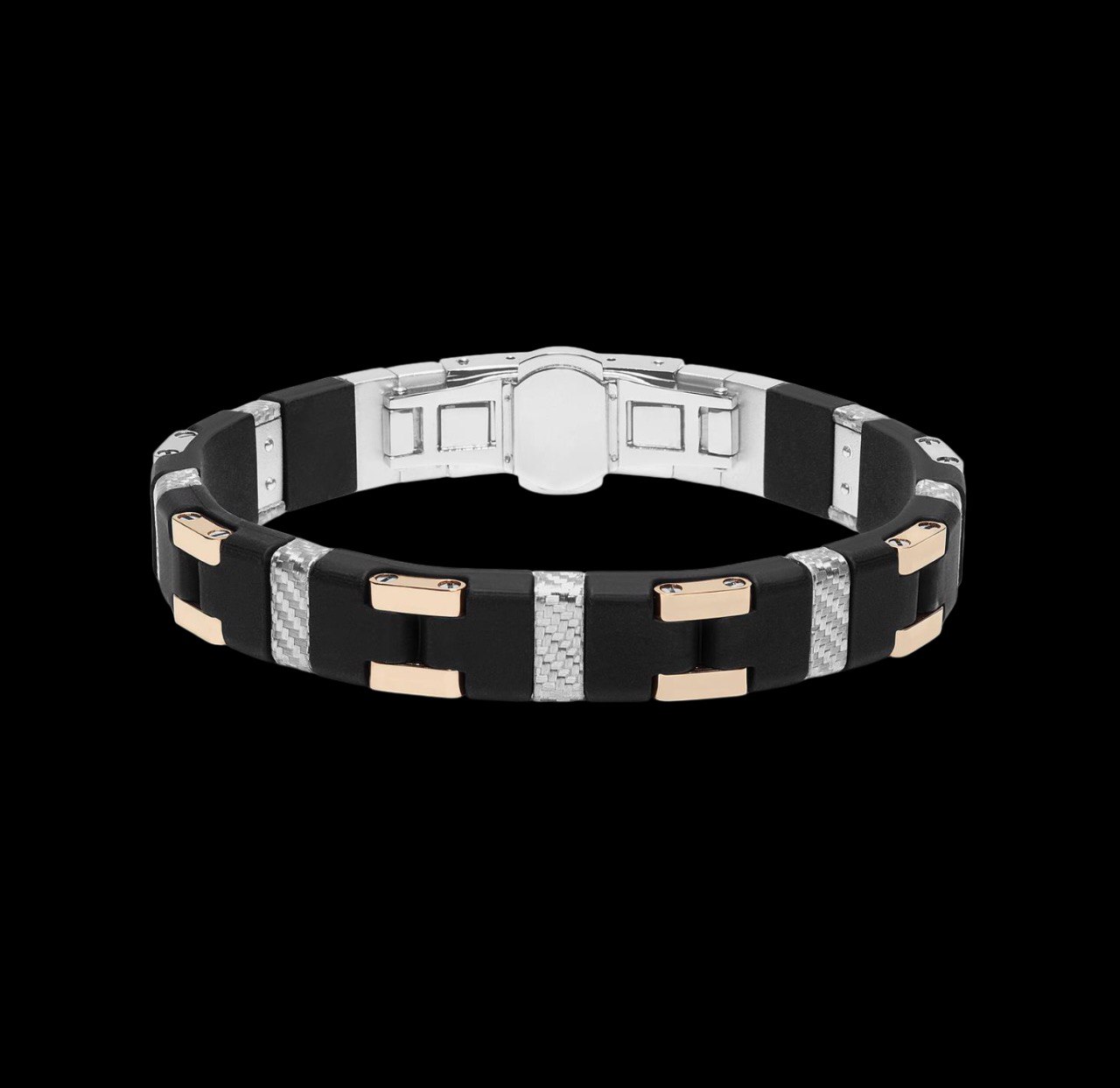 Браслет Baraka Uomo вирізняється сміливим поєднанням матеріалів і сучасною інженерною естетикою. Він виготовлений із рожевого золота 750‰ (18 карат), міцного срібла 925‰ та гіпоалергенної гуми, а декоративні вставки з вуглецевого волокна додають йому футуристичного характеру й технологічного шарму.Конструкцію завершує надійна застібка з нержавіючої сталі, що гарантує комфортне та довговічне носіння.