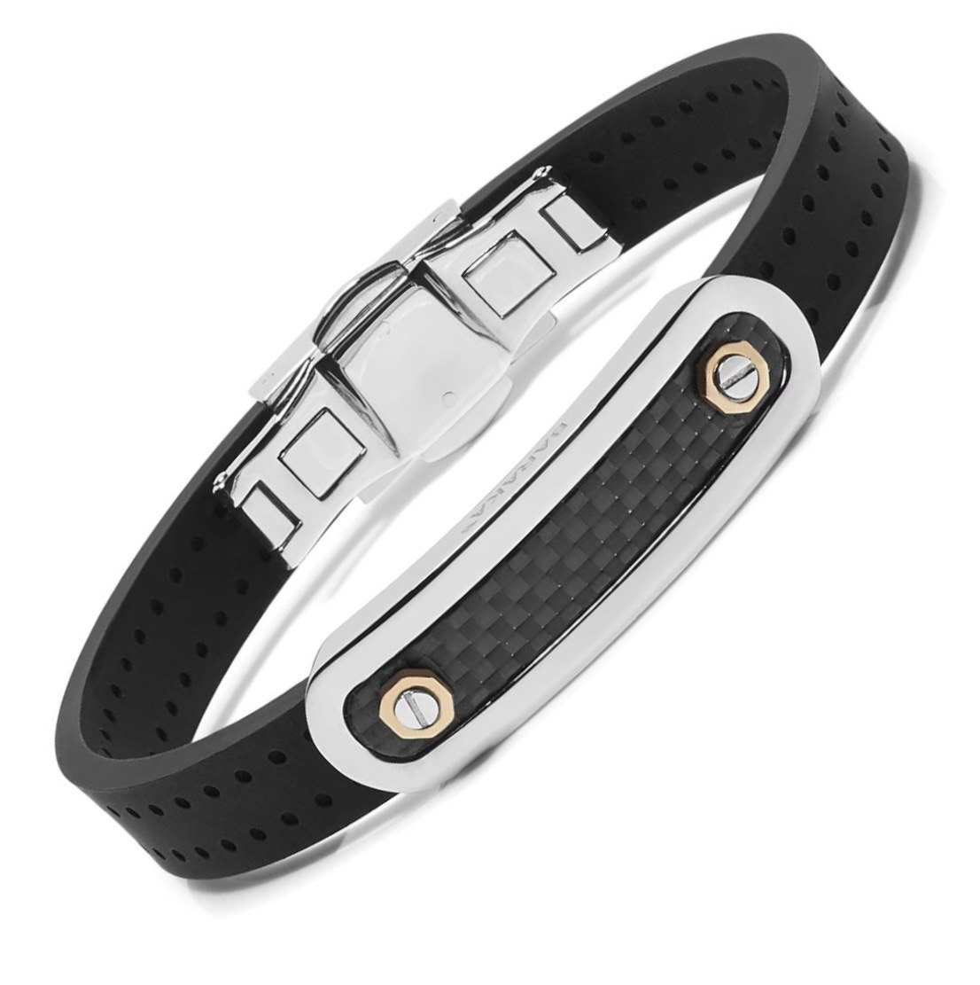 Браслет Baraka Uomo вирізняється технологічним стилем, сміливим поєднанням матеріалів і сучасною інженерною ергономікою. Він виготовлений із сталі 316L, гіпоалергенної гуми, декоративної вставки з вуглецевого волокна що додає йому футуристичного характеру а також золотих вставок у вигляді болтів і гайок що додають йому технологічного шарму.Конструкцію завершує надійна застібка з нержавіючої сталі, що гарантує комфортне та довговічне носіння.