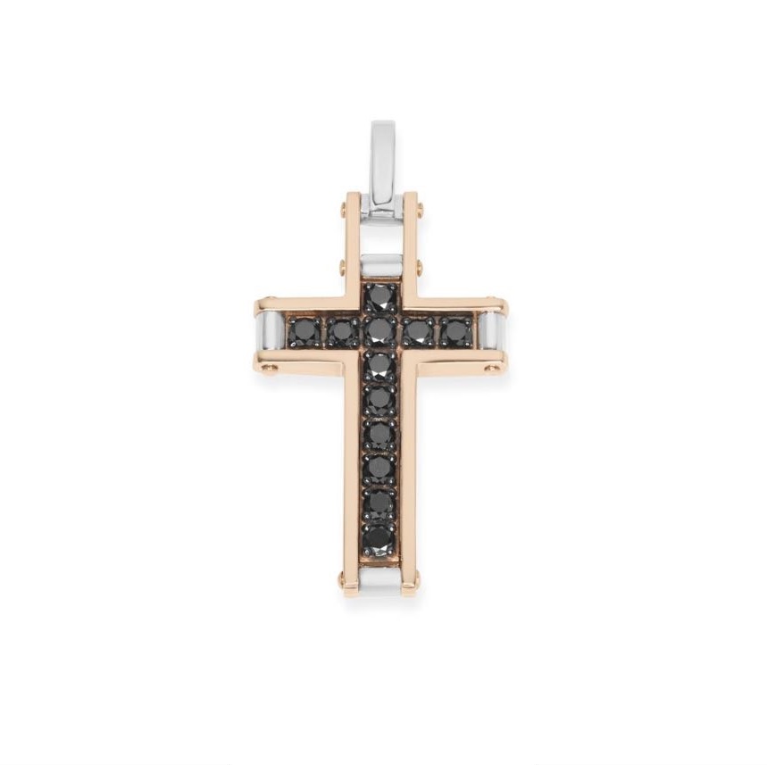 Кулон у формі хреста Baraka Uomo, виготовлений з рожевого і білого золота 750‰ та чорних діамантів. Розкішний хрест для чоловіків з вишуканим та елегантним смаком. У цій прикрасі, виготовленій в Італії,гармонійно переплетені прямі лінії та простір заповнений чорними діамантами. Мова і форма ідеально поєднуються в цьому кулоні з вишуканим дизайном. Поєднання матеріалів, форм і текстур підсилює сучасний шарм цього рукотворного виробу що виготовлений в Італії.