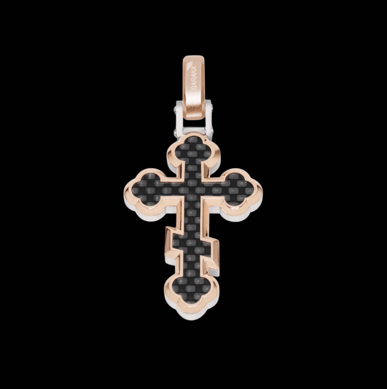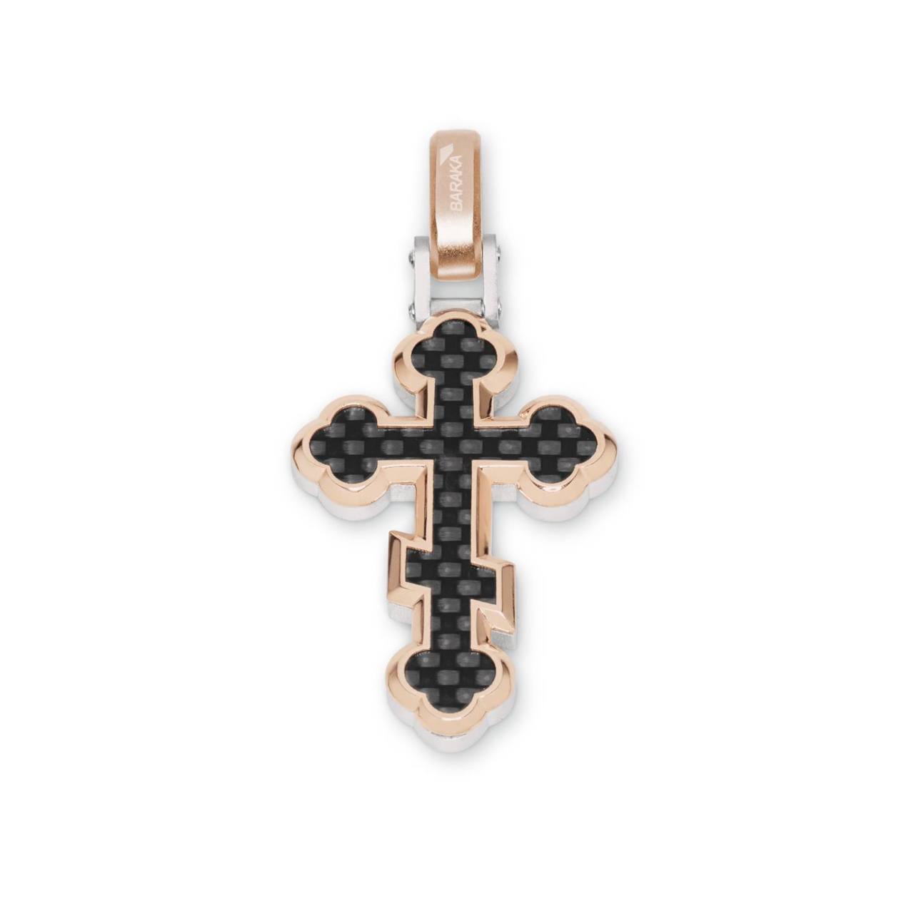 Xрест Baraka Uomo Fiber з чорною карбоновою вставкою. Підвіска виготовлена італійським ювелірним домом Baraka, який спеціалізується на розкішних чоловічих аксесуарах. Виріб поєднує рожеве та біле золото 750 проби (18 карат), срібло 925 проби та чорний карбон. Хрест має характерний сучасний дизайн з індустріальною естетикою, де жорсткі лінії та технічні елементи поєднуються з дорогоцінними металами. Вставки з карбонового волокна надають прикрасі міцності та унікального зовнішнього вигляду. Зроблено в Італії.