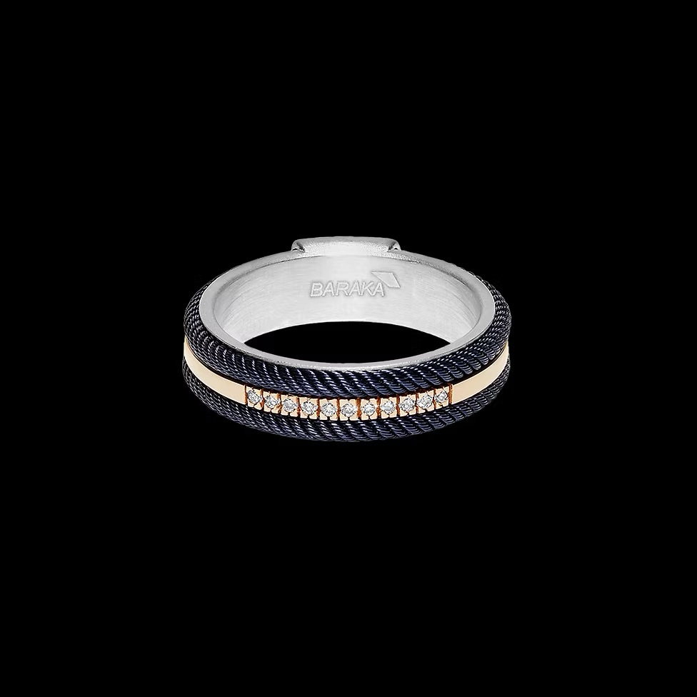 Створена майстрами Baraka Uomo для сучасного чоловіка, який прагне виражати елегантність у кожній деталі. Корпус каблучки виконано зі сталі 316 з тонких переплетених тросів, центральна обручка — з 18-каратного рожевого золота, прикрашена паве з білих діамантів загальною вагою 0,11 карата. Внутрішня частина зі срібла 925‰ з гравіюванням.