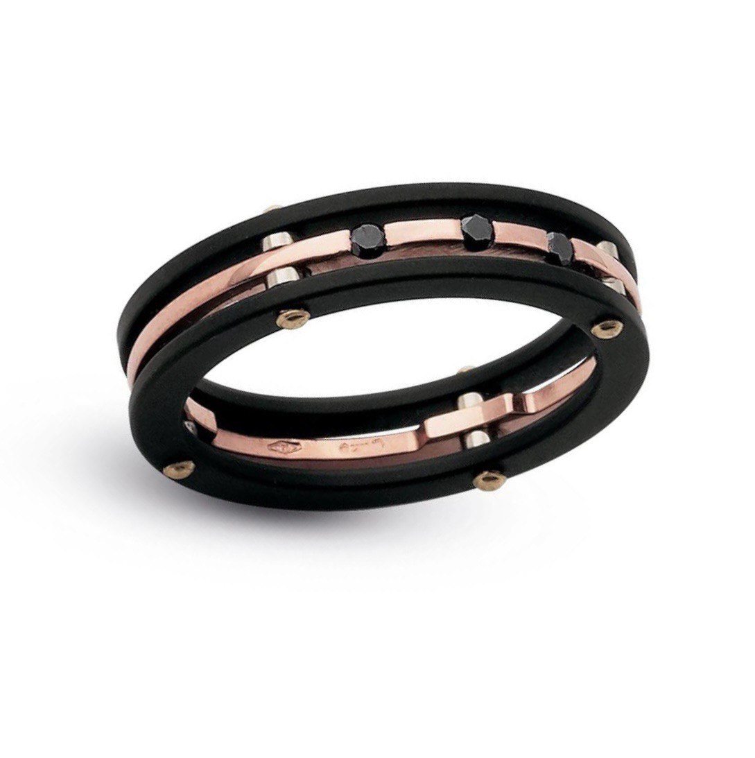 Чоловіча каблучка Baraka Uomo виконана з рожевого золота 750‰ (18 карат) у поєднанні з нержавіючою гіпоалергенною сталлю та PVD покриттям, створюючи гармонійний баланс між розкішшю та сучасною мужністю. Три чорні діаманти загальною вагою 0,15 карата додають прикрасі виразності та підкреслюють увагу бренду до деталей.