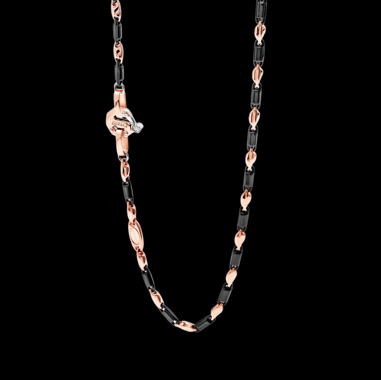 Чоловічий ланцюг Baraka Uomo , виготовлений з рожевого золота 750‰ (18 карат) та високотехнологічної ювелірної чорної кераміки. Оснащений восьмикутною запатентованою застібкою з рожевого золота 750 проби, інкрустованою білим діамантом вагою 0,02 карата.