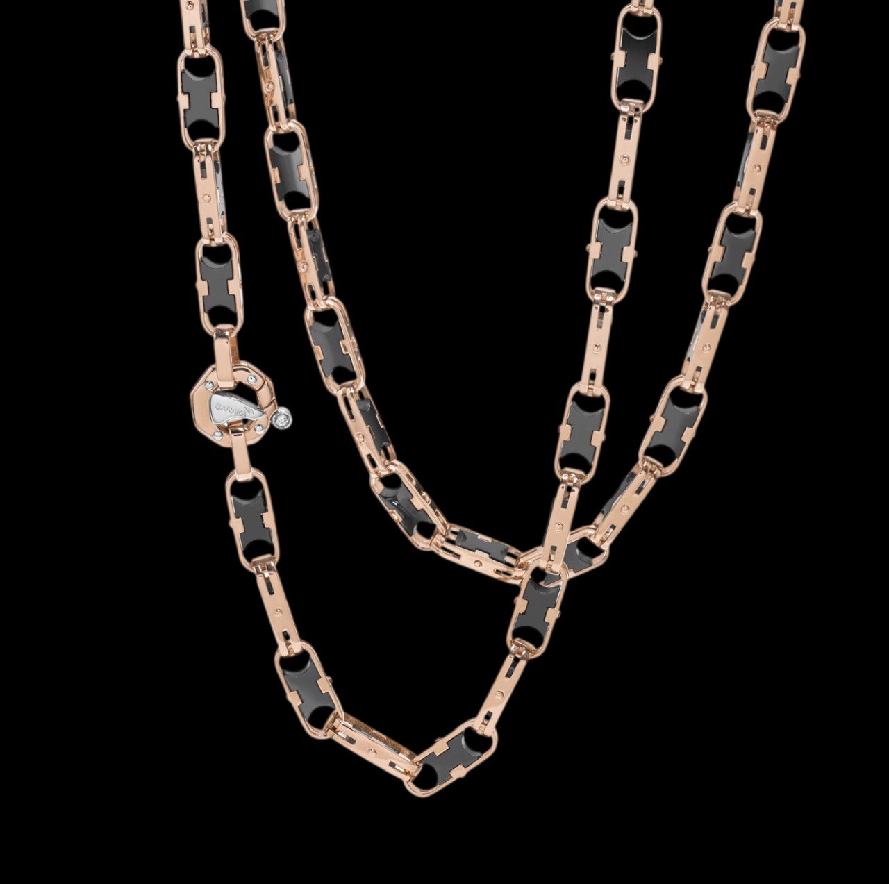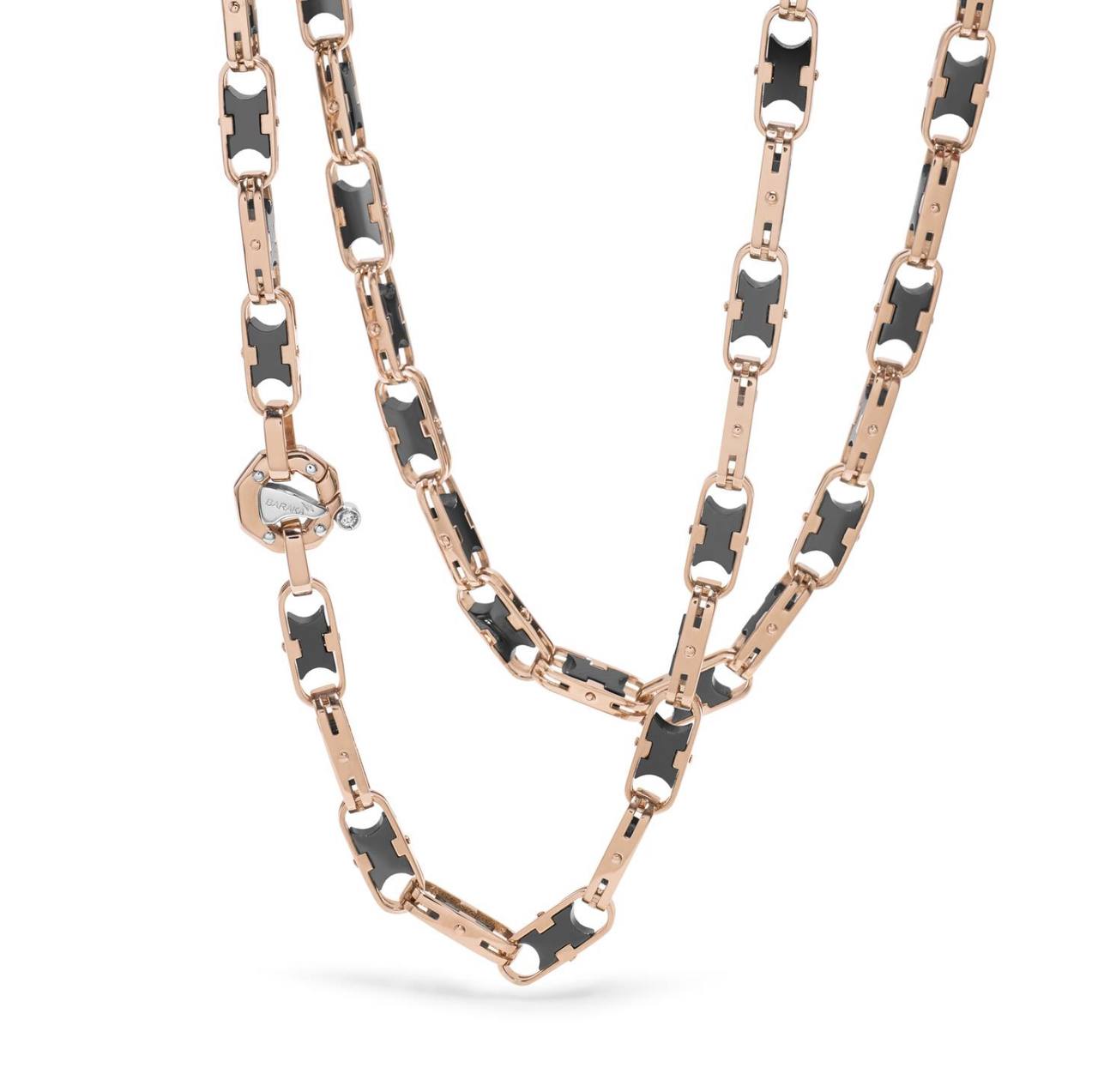 Чоловічий ланцюг Baraka Uomo з рожевого золота 750‰ і чорної кераміки. Застібка з деталлю з білого золота 750‰ і білим діамантом P.Ct 2. Чоловічий ланцюг із золота і кераміки для бізнесмена, який цінує престижні деталі і хоче виразити свою оригінальність. Двоколірність надає прикрасі сучасного чоловічого шарму, а виготовлення підкреслює її інженерну цінність. Доступний у різних кольорах золота. Вироблено в Італії.Прикраса з класичним дизайном, переосмисленим у його найсучаснішому розумінні. Рожеве золото і чорна кераміка переплітаються в елементах кільця вишуканої форми, створюючи намисто з механічним шармом, де інновація стає ключовим елементом. Характерна восьмикутна застібка Barakà із золота, запатентована для спрощення носіння прикраси, стає ідеальним поєднанням стилю і майстерності Made in Italy.