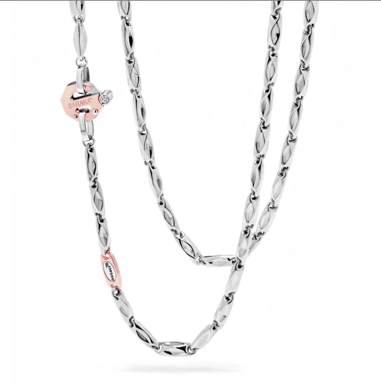 Чоловічий ланцюг Baraka Uomo з білого золота 750‰. зі вставками з рожевого та надзвичайно елегантним плетінням. Восьмикутна застібка з білим діамантом, відібраним P.Ct 2. Чоловічий ланцюг з білого золота, ідеальний для чоловіків, які хочуть виділитися на важливих заходах, світських зустрічах та в будь-яких інших життєвих ситуаціях. Ланцюг випромінює розкіш у стриманій і рішучій манері. Чоловічий ювелірний виріб, розроблений та створений дизайнерами та ювелірними майстрами компанії Baraka повністю виготовлений в Італії.
