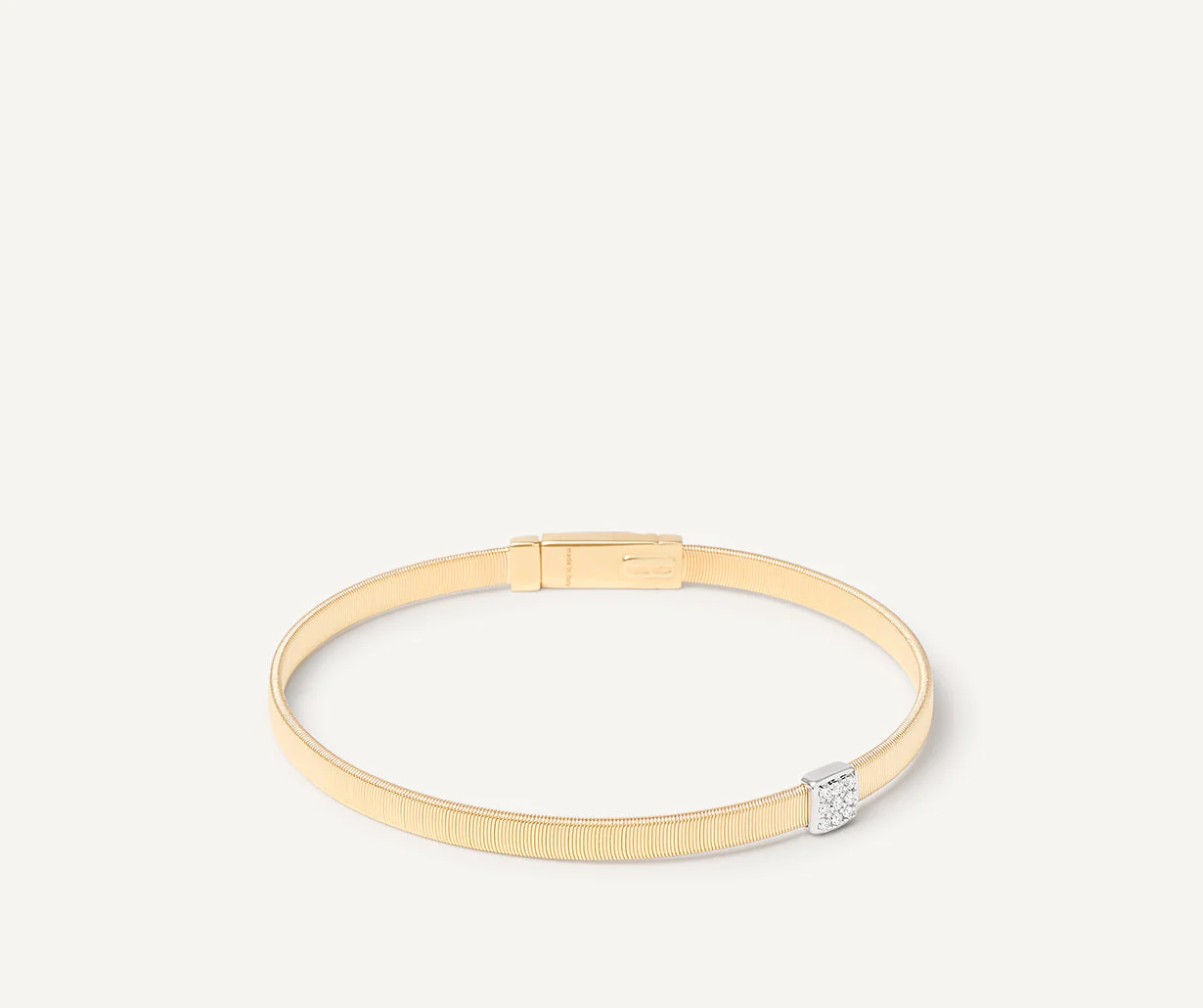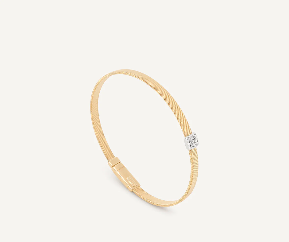 Однорядний банґл із жовтого золота 18 карат з колекції MASAI від Marco Bicego поєднує плоску спіральну нитку з діамантовим паве вагою 0,063 карат. Лаконічний та елегантний дизайн, діаметр – 5,7 см.
