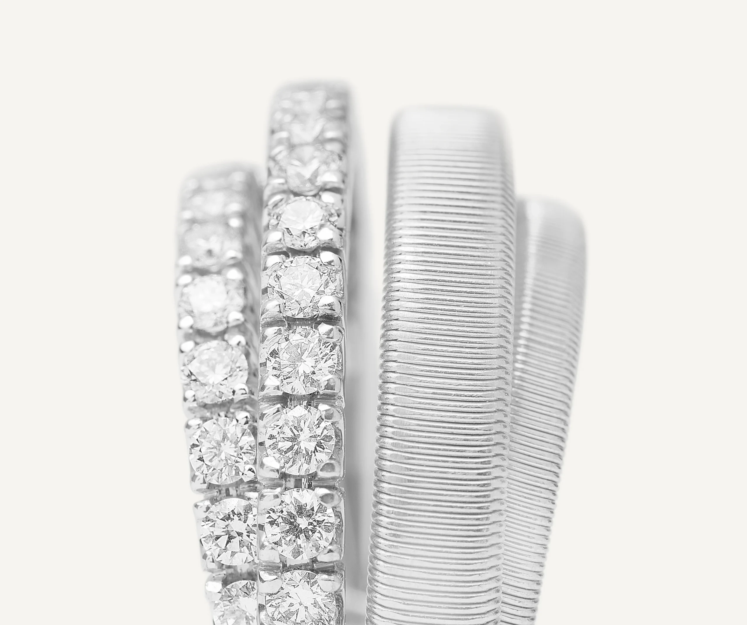 Чотирирядна каблучка із білого золота 18 карат з колекції MASAI від Marco Bicego поєднує дві плоскі спіральні нитки з двома смужками діамантового паве загальною вагою 0,10 карат.