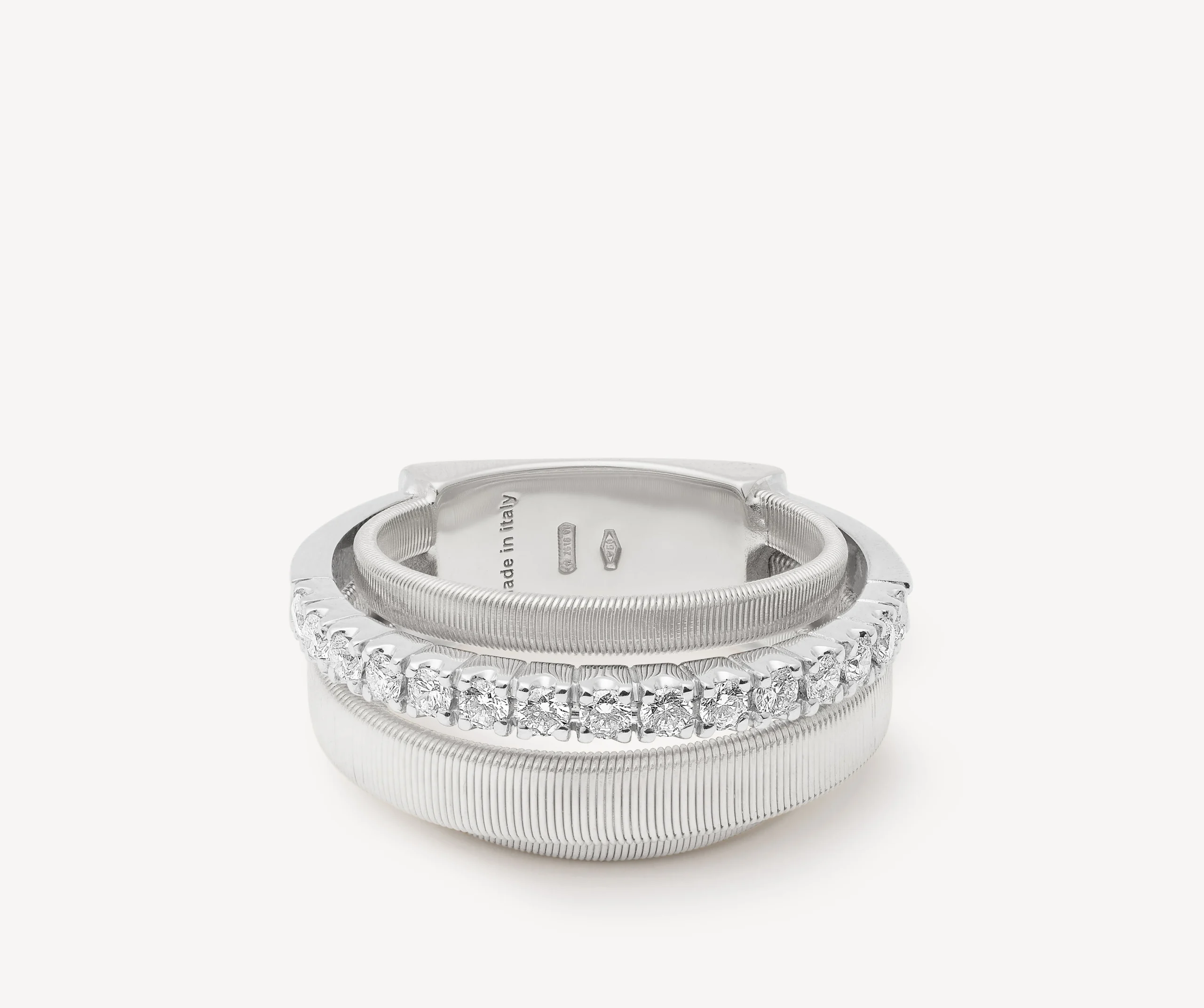 Каблучка з білого золота 18 карат від Marco Bicego вражає гармонійним поєднанням фірмового спірального дизайну та ювелірної витонченості. Чотири пасма утворюють динамічний силует: три пласкі нитки виконані за ексклюзивною технікою coil, яка надає металу характерної текстури та легкого руху, тоді як четверте пасмо повністю інкрустоване діамантовим паве загальною вагою 0,375 карата.Контраст між структурою золотих спіралей і бездоганним блиском діамантів створює витончений візуальний ритм. Каблучка виглядає сучасно, але водночас позачасово — це прикраса, яка однаково гарно пасує як для щоденного стилю, так і для особливих подій. Ідеальний must-have для жінки, що цінує тонку елегантність і унікальну майстерність Marco Bicego.