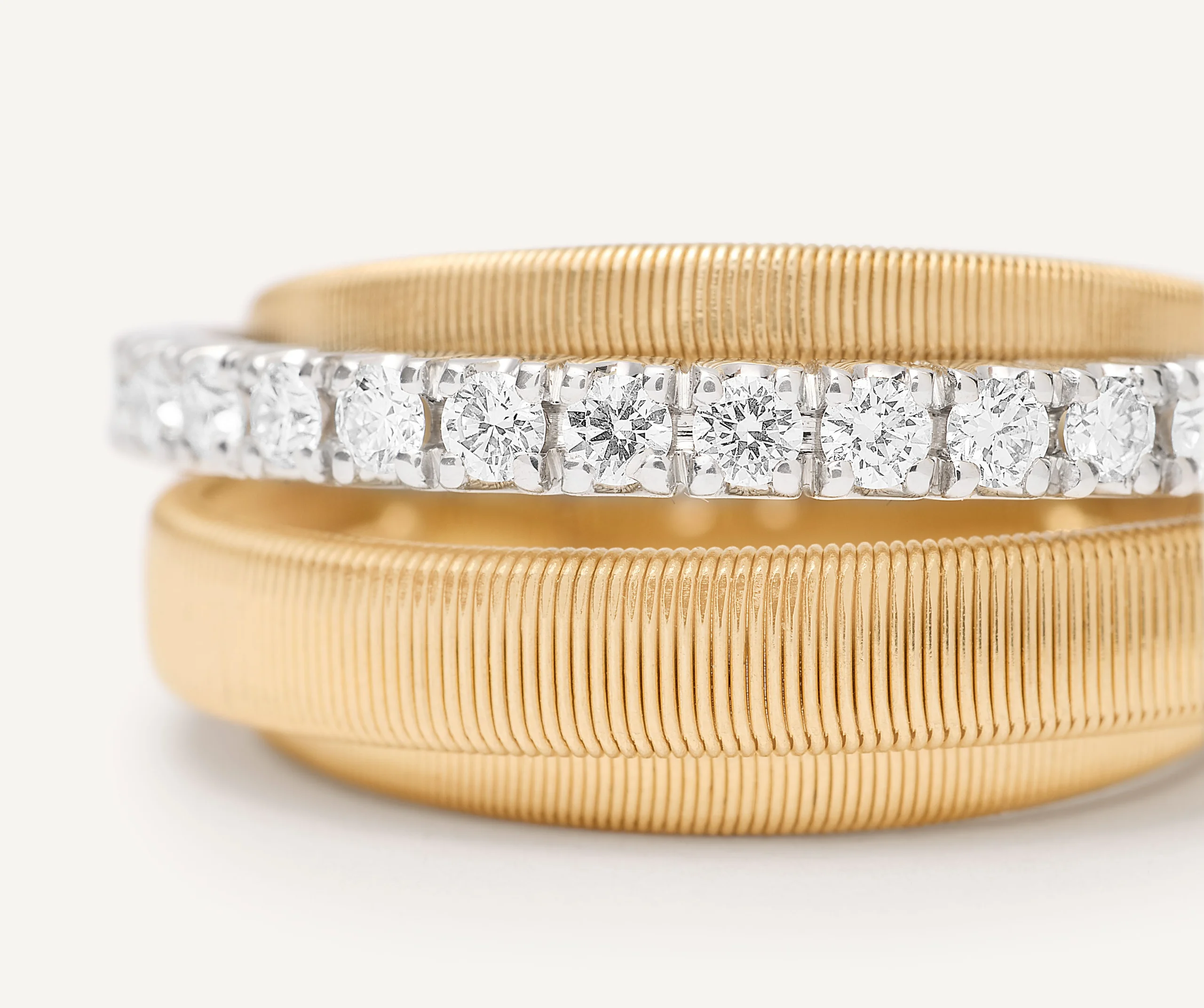 Чотирирядна каблучка із жовтого золота 18 карат з колекції MASAI від Marco Bicego об’єднує три плоскі спіральні нитки з діамантовим паве 0,375 карат. Її витончене переплетення відображає фірмову ручну техніку coil та додає сяйва будь-якому образу.