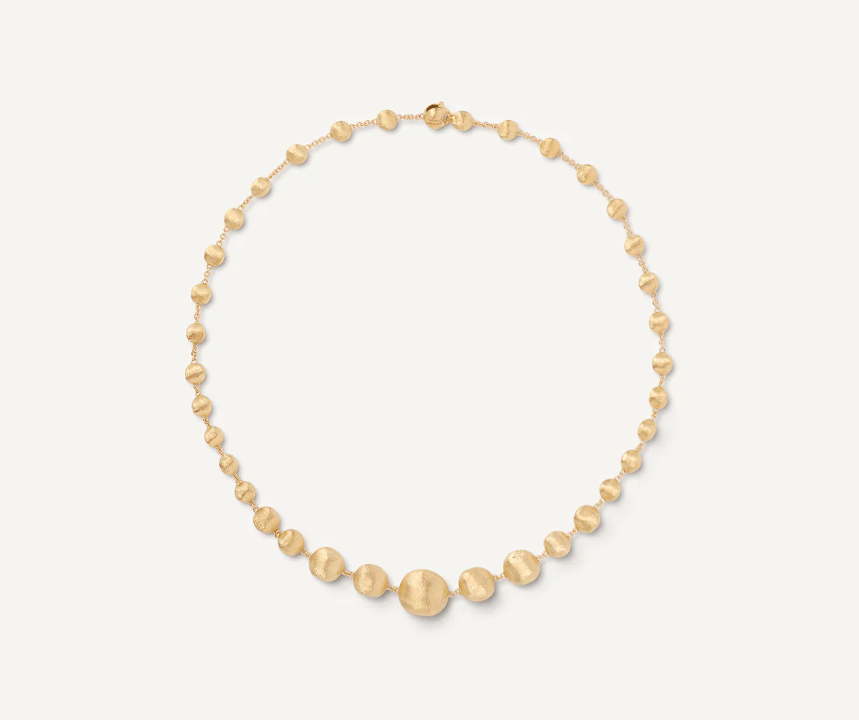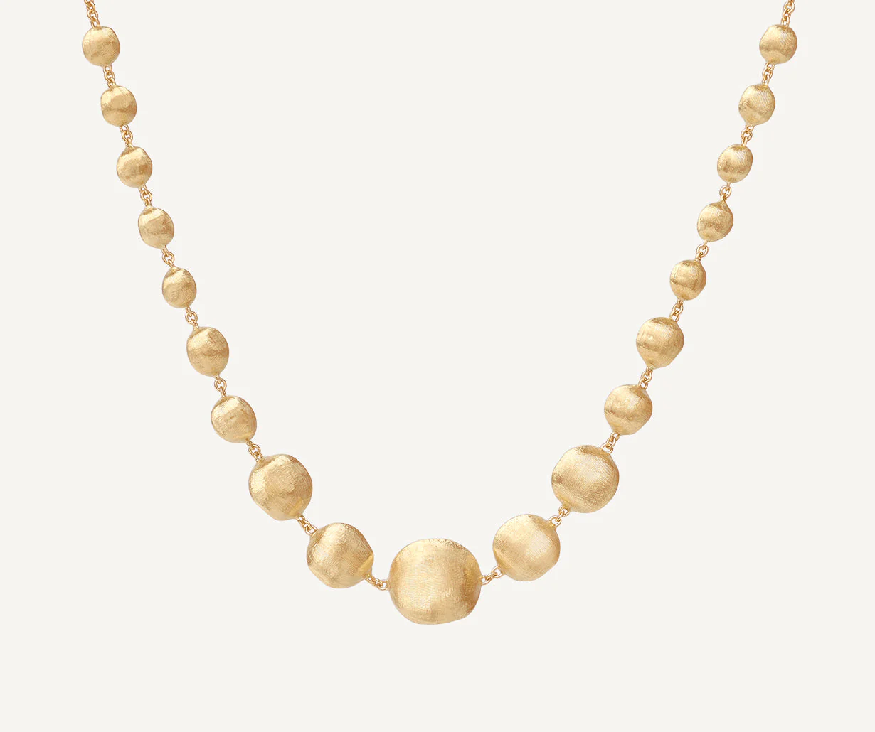 Кольє з намистин із жовтого золота 18 карат — це вишукана прикраса, у якій поєднані традиційна майстерність і сучасний стиль Marco Bicego. Намистини різного розміру створюють природний ритм і м’який об’єм, плавно лягаючи по лінії шиї. Кожен елемент вигравіюваний вручну за стародавньою флорентійською технікою, що надає поверхні характерної шовковистої текстури та делікатного матового сяйва.Довжина 43 см дозволяє кольє ідеально розташовуватися на ключицях, роблячи його універсальним для щоденного носіння та урочистих подій. Воно чудово поєднується з іншими виробами бренду або виступає самостійним стильним акцентом, додаючи образу тепла, елегантності й вишуканого італійського шарму.