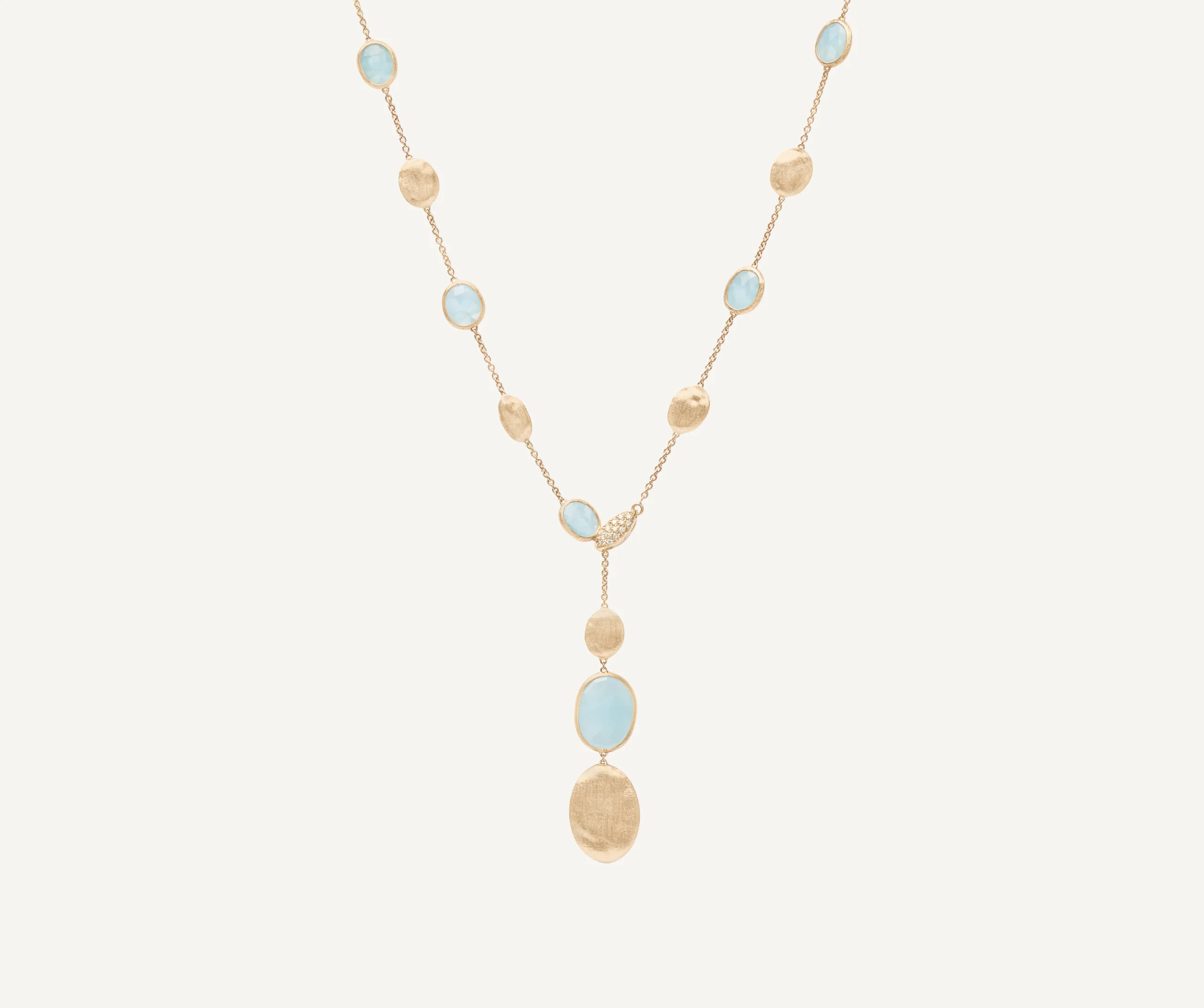 Кольє-ларіат із жовтого золота 18 карат від Marco Bicego поєднує ретельно відібрані молочні аквамарини з овальними золотими елементами, вигравійованими вручну за стародавньою флорентійською технікою. Така обробка надає металу характерної шовковистої текстури та м’якого, розсіяного сяйва, що підкреслює ніжні відтінки каміння.