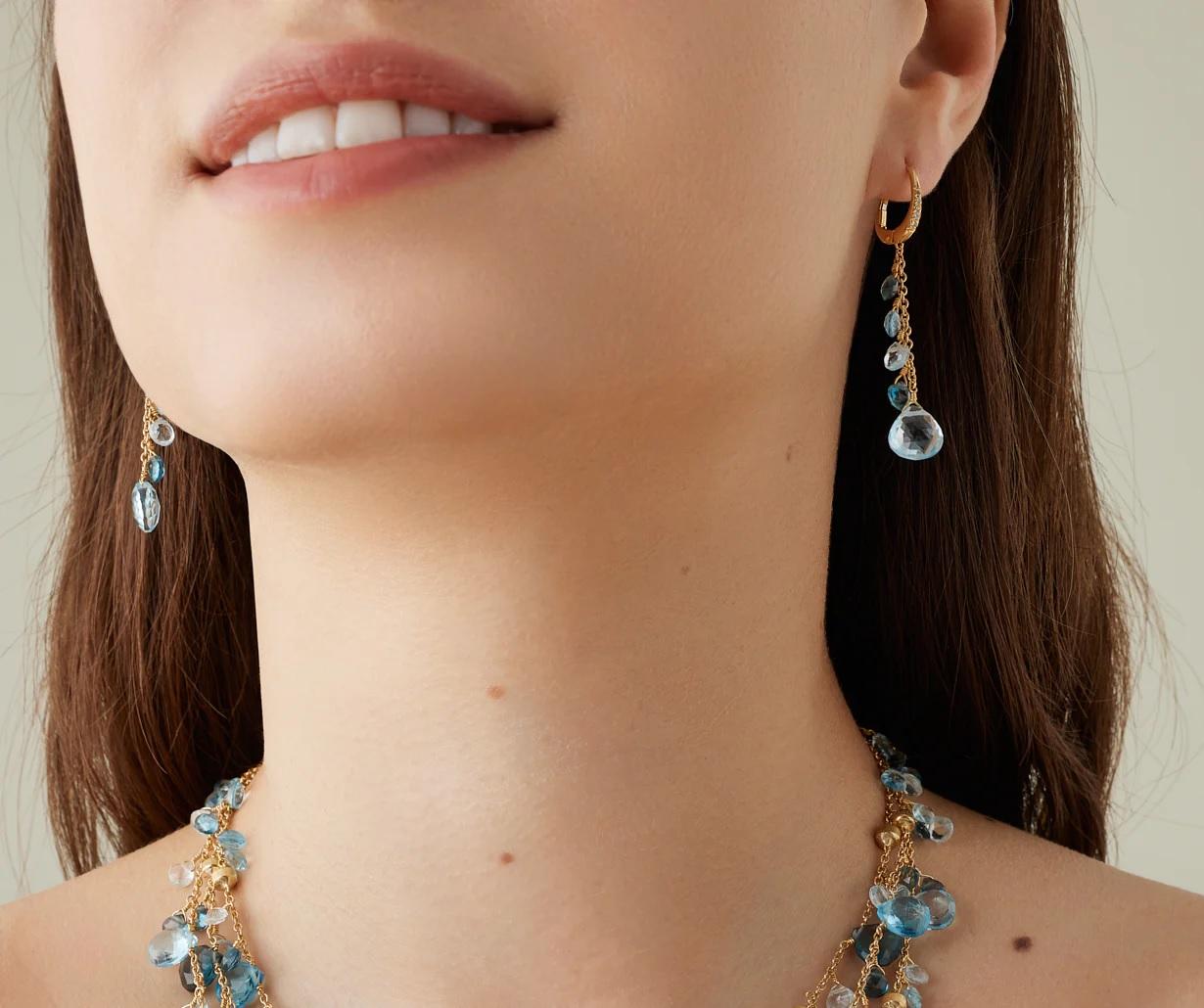 Сережки-підвіски від Marco Bicego з жовтого золота 18 карат прикрашені дорогоцінною застібкою-кліпсою з діамантами блискучого огранювання та каскадом ретельно підібраних топазів у формі серця, які збагачують коштовність своїми насиченими кольорами.