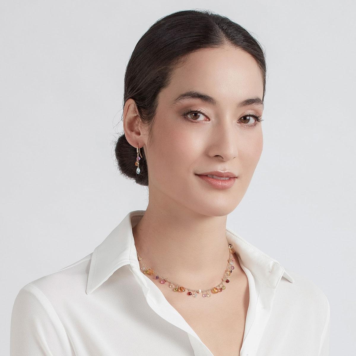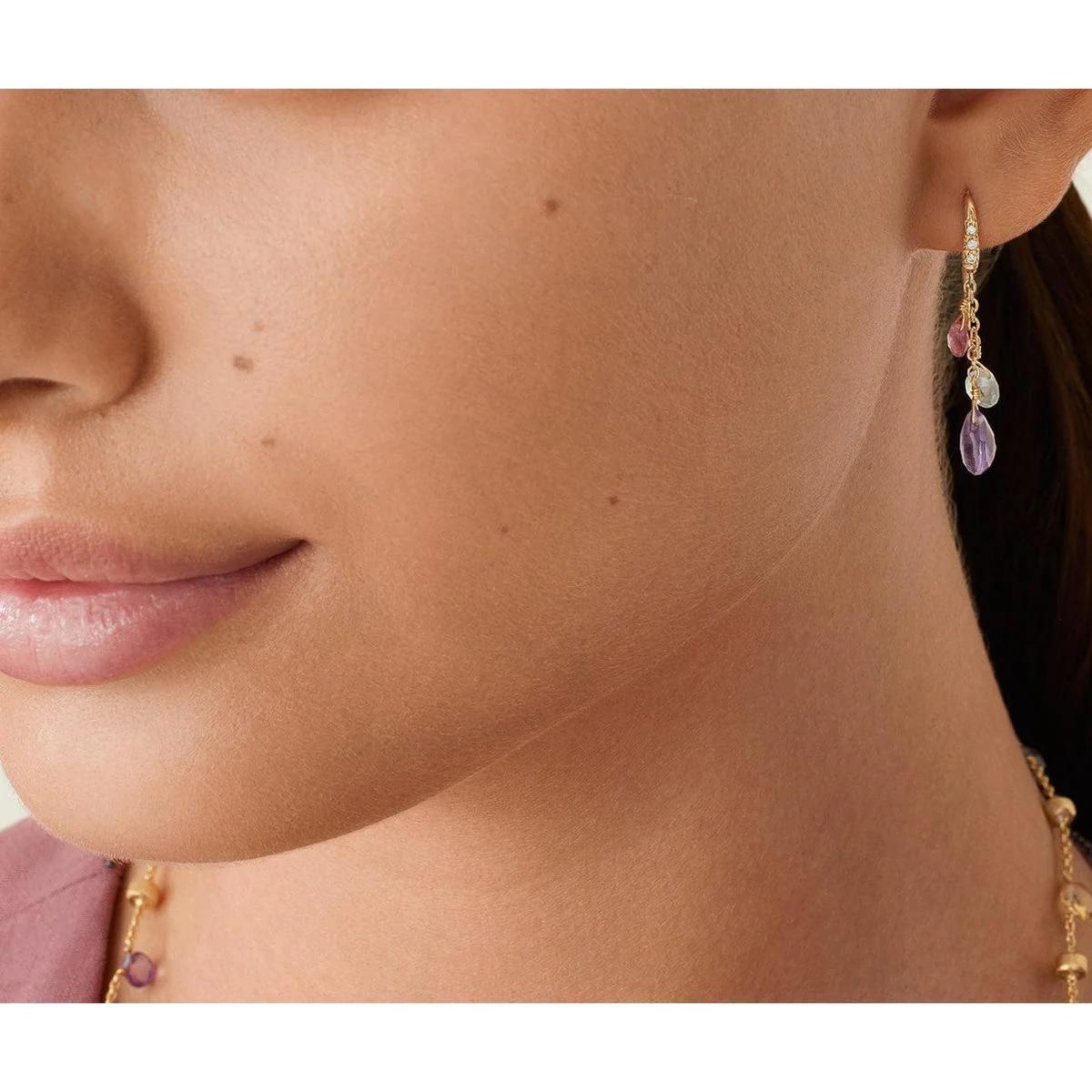 Ця елегантна, стримана сережка-підвіска прикрашена каскадом різнокольорових дорогоцінних каменів у формі серця. Справжній must-have, вона прикрашена дорогоцінним гачком, інкрустованим діамантами блискучого огранювання.