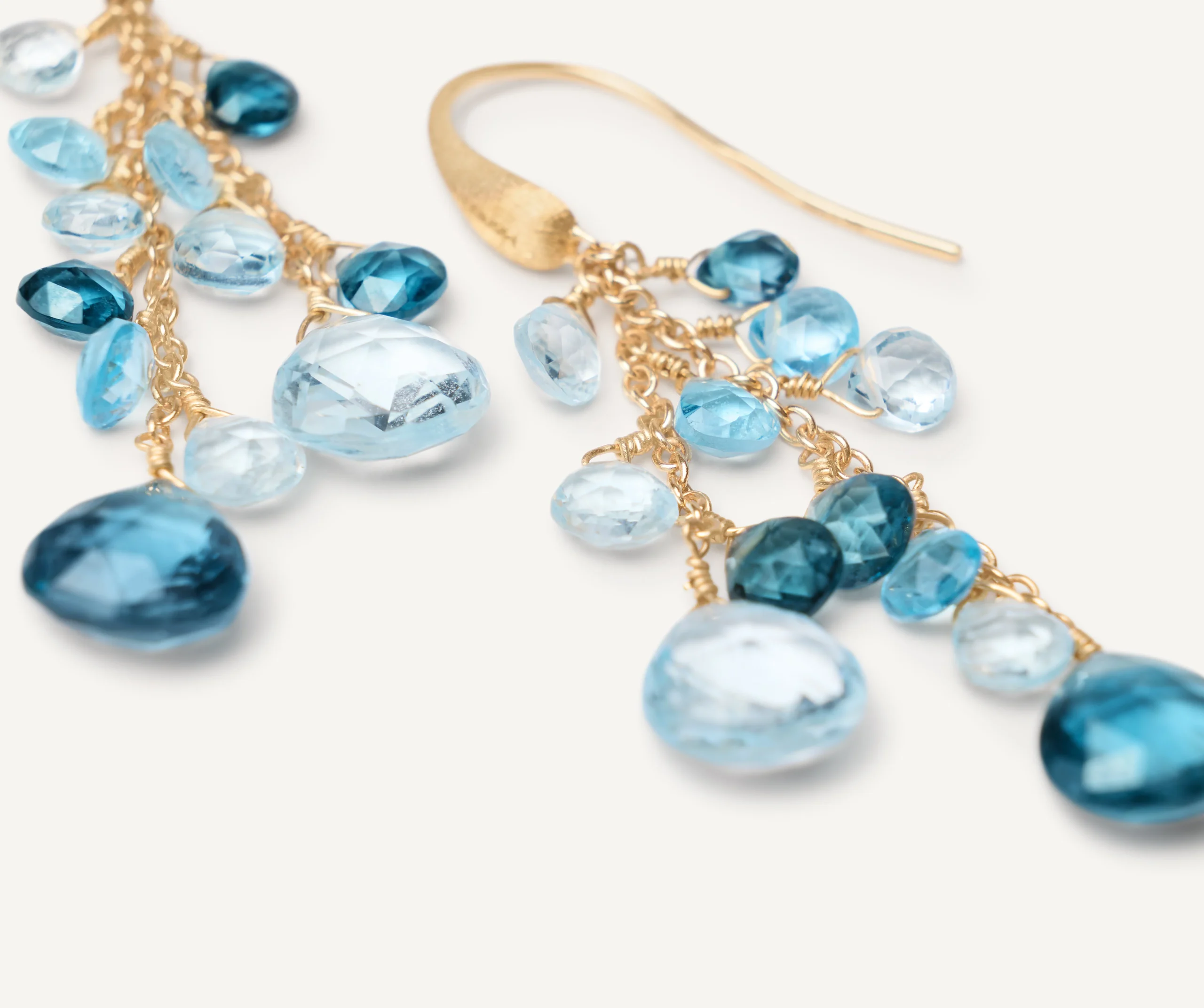 Ці сережки з кількох пасм із топазами — витончений акцент, що поєднує легкість руху й багатство кольору. Каскад топазів у формі серця, підібраних у різних відтінках блакитного, створює ніжний градієнт і водночас привертає погляд глибиною сяйва. Жовте золото 18 карат, з якого виконано гачок, вигравійоване вручну за стародавньою флорентійською технікою, надаючи металу характерної оксамитової текстури.