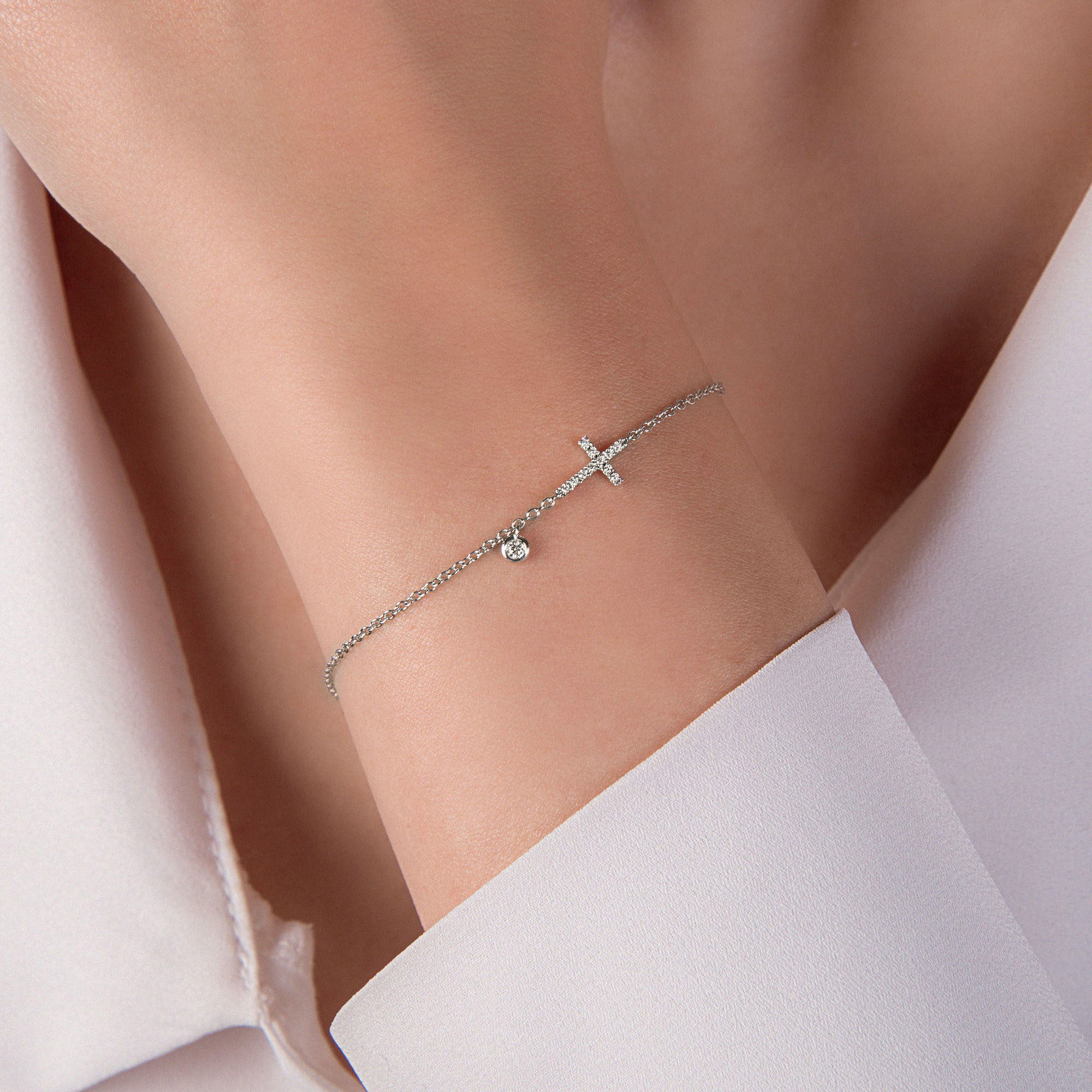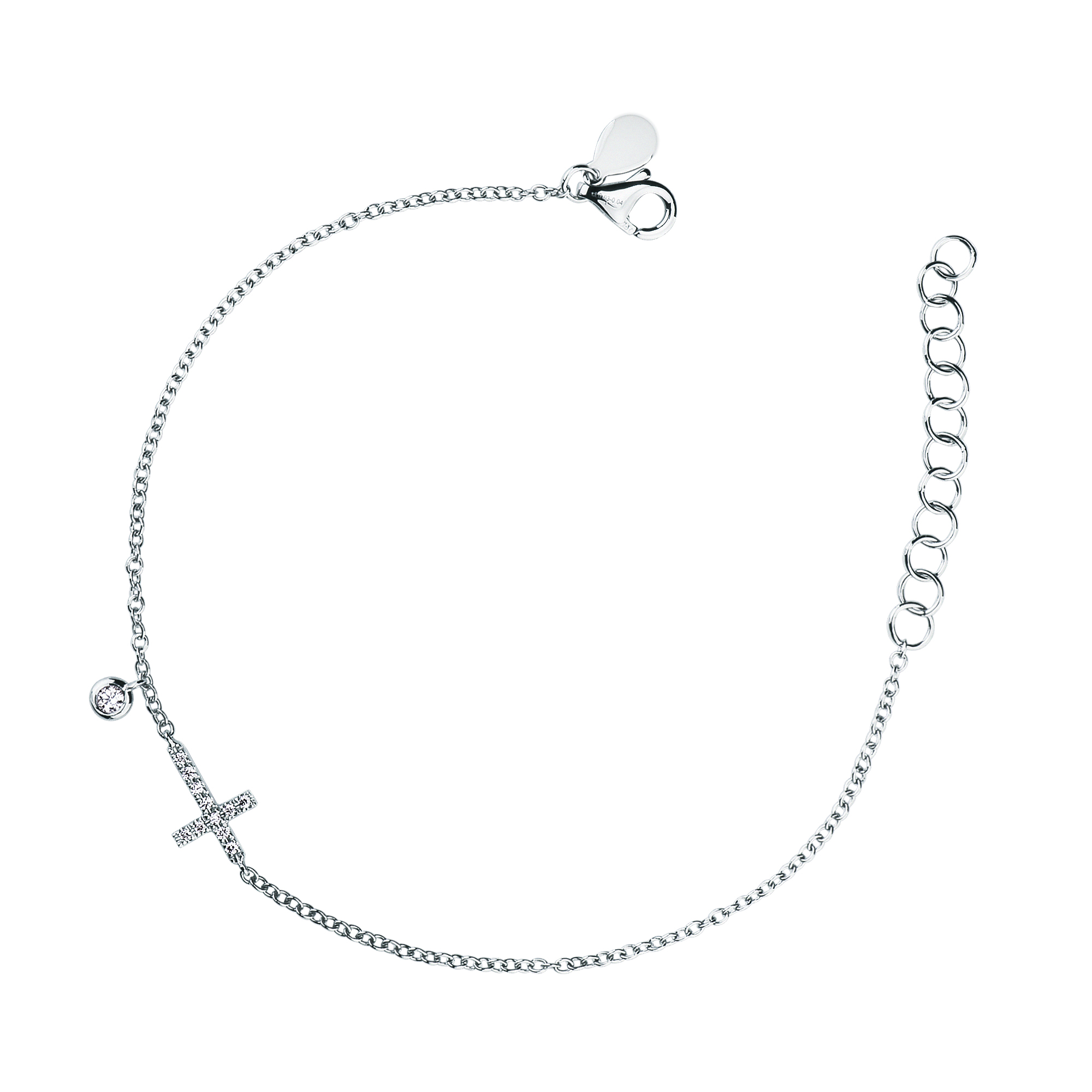 Делікатний браслет із білого золота 18 карат (1,70 г) від Mirco Visconti вражає гармонійним поєднанням мінімалізму та символічності. Центральний акцент — витончений хрест, інкрустований діамантами загальною вагою 0,07 карата (0,03 + 0,04 ct), що м’яко виблискують при кожному русі.