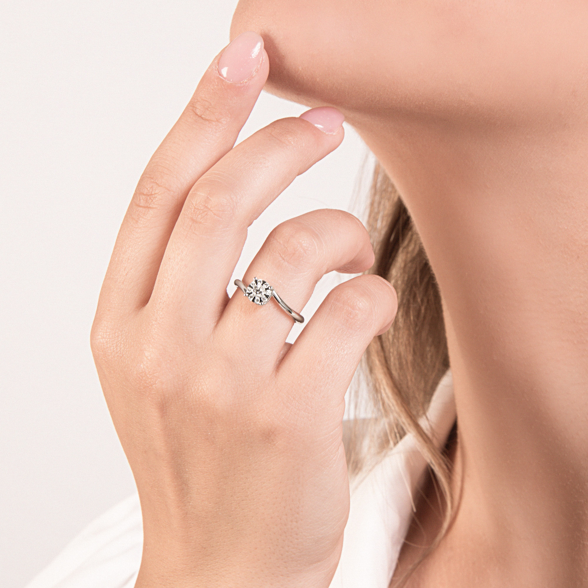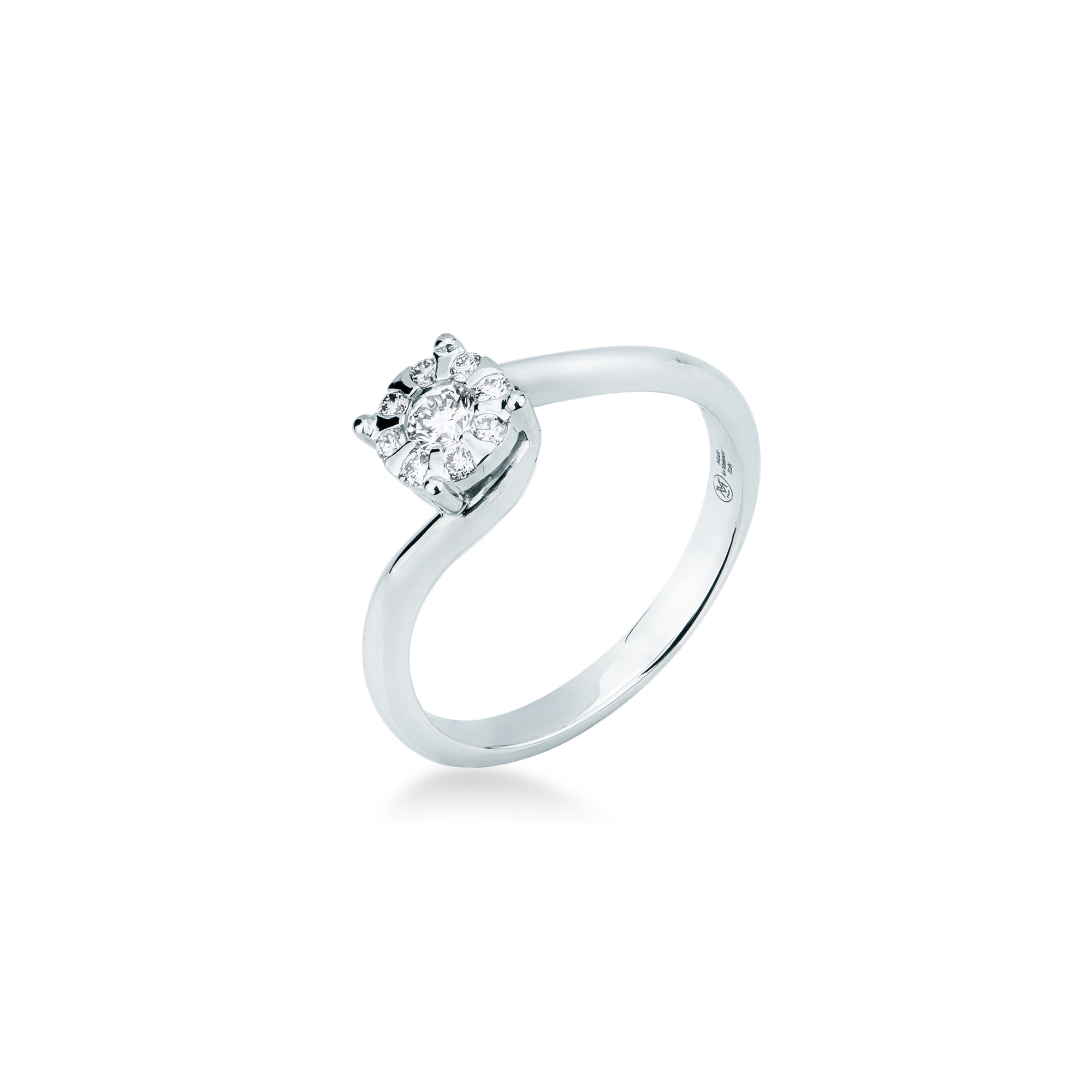 Вишукана каблучка від Mirco Visconti, виконана з білого золота 18 карат і прикрашена діамантами загальною вагою 0,12 карата, уособлює стриману розкіш та вічну елегантність. Точна огранка додає камінцям глибини й блиску, а ретельне полірування золота створює м’яке світлове сяйво.