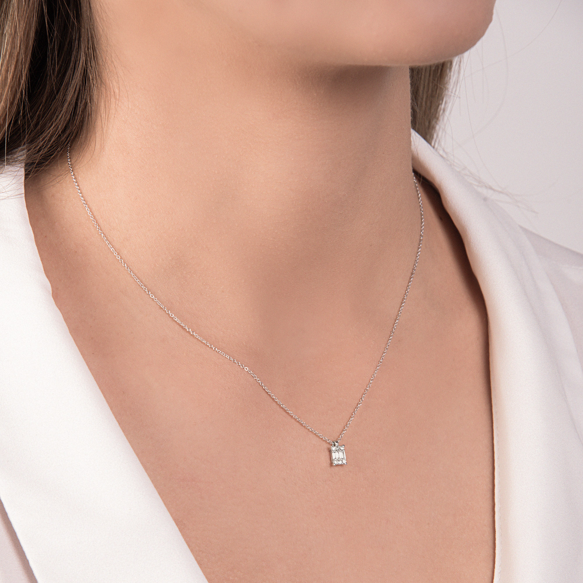 Елегантний кулон Diamond Emerald від Mirco Visconti — це втілення сучасної геометрії та класичного сяйва. Створений з білого золота 18 карат вагою 2,40 г, він інкрустований діамантами загальною вагою 0,21 карата (0,17 + 0,04 ct), викладеними у прямокутну форму, що нагадує огранювання “baguette”.